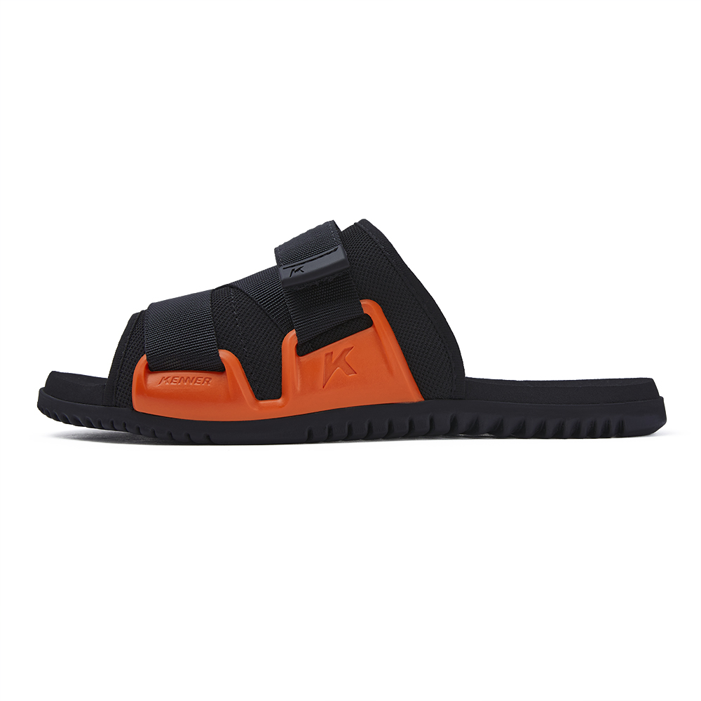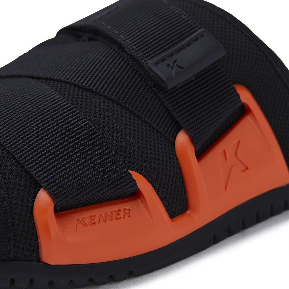 1.גפת ניילון שחורה שמצטלבת על כף הרגל להתאמה מתכווננת עם אבזם פרימיום עם לוגו Kenner.